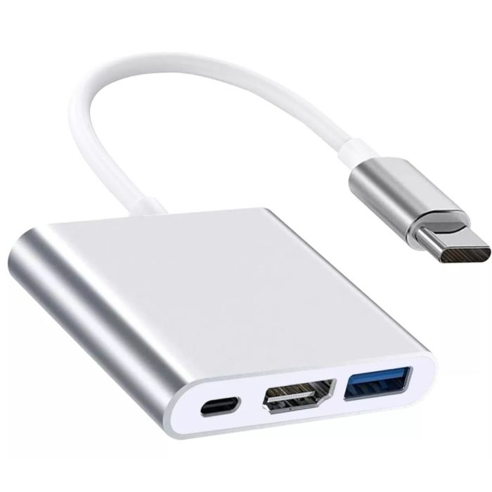 ADAPTADOR USB TIPO C MULTIPUERTO 3 EN 1. Con un puerto tipo C, un puerto USB3.0 y un puerto HDMI, conectado con un puerto de salida tipo C, que proporciona una alta velocidad de transferencia de datos; carga rápida para su computadora portátil; y expansión de imágenes vívidas a través de HDMI.