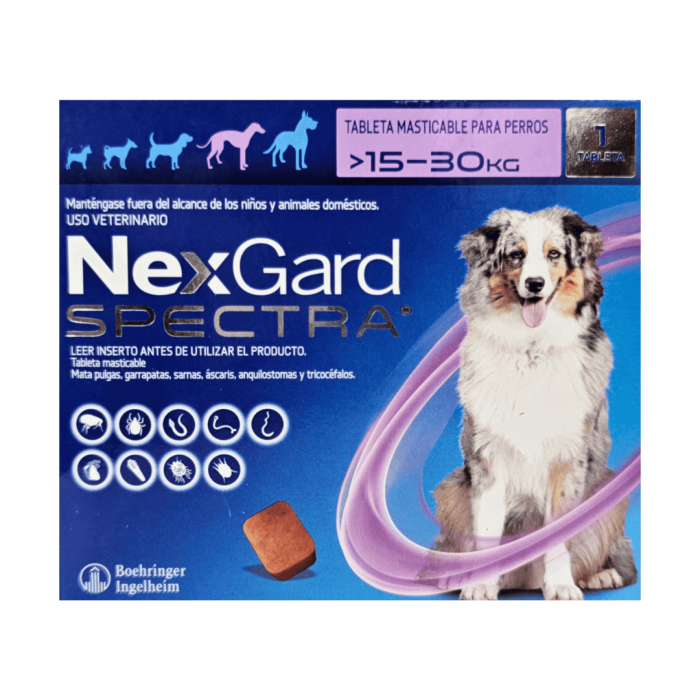 NexGard Spectra es un tratamiento antiparasitario de última generación diseñado específicamente para perros que pesan entre 15 kg y 30 kg. Este producto combina dos ingredientes activos altamente efectivos que ofrecen una protección integral contra pulgas, garrapatas y parásitos intestinales.