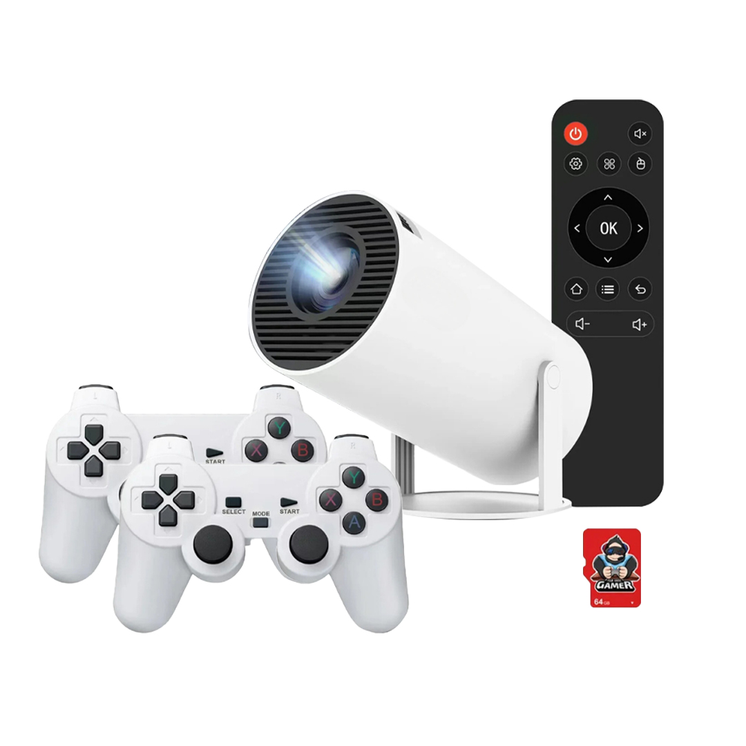 Proyector portátil diseñado para videojuegos, incluye dos controles inalámbricos para partidas en pareja.