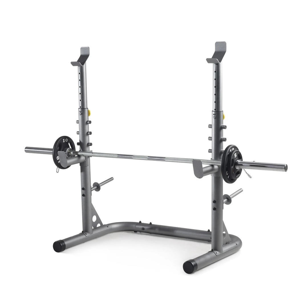 Soporte de entrenamiento versátil y robusto para uso doméstico, diseñado para sentadillas, press de banca y otros ejercicios de fuerza. Cuenta con soportes ajustables, almacenamiento de discos incorporado, capacidad de carga de 300 lbs