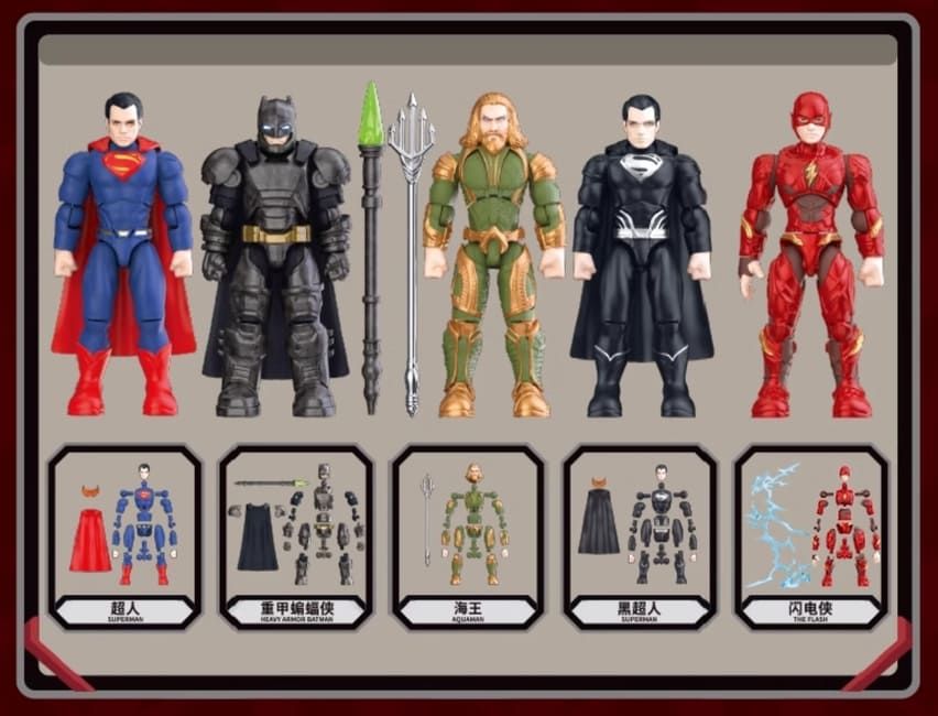 Son figuras de acción artículadas armables, son 5 modelos diferentes con accesorios: Flash, Aquaman, Batman Armored, Superman, Superman traje negro.